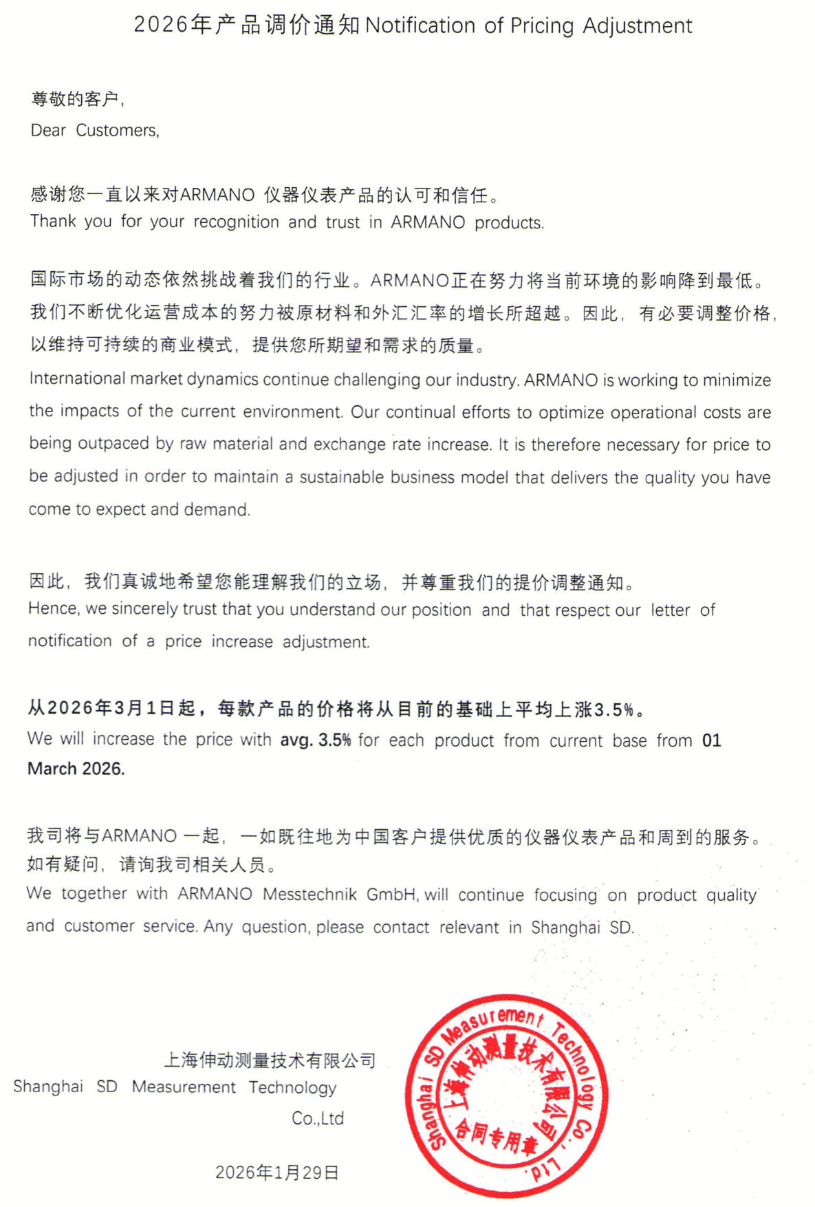 2026年ARMANO产品调价通知